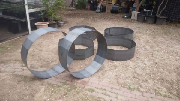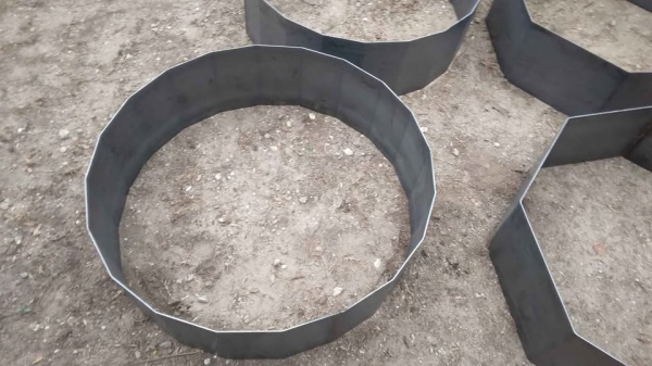 These elegant raw steel fire pit rings can also work well as planters. They are 38" diameter, 12" tall, constructed of 11 gauge (1/8") raw steel which developes a gorgeous rustic patina as it weathers. The vertical creases make them one of kind and reflect light to different angles for a stunning appearance. Handmade in Austin TX.