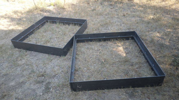 These elegant raw steel planters are 4 feet square and 8" tall. Constructed of 11 gauge (1/8") raw steel which developes a gorgeous rustic patina as it weathers. Handmade in Austin TX.