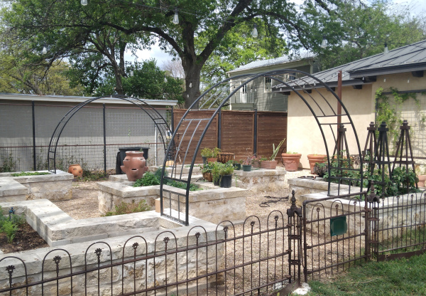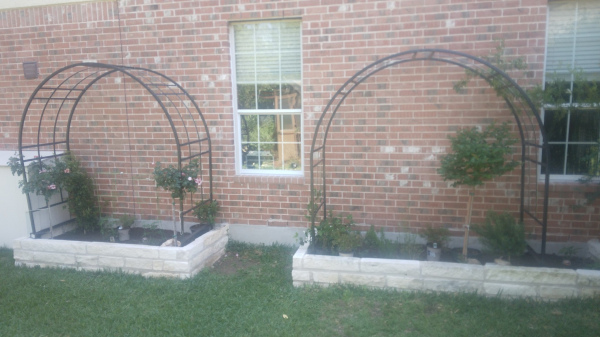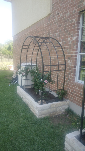 5 feet wide, 7 feet tall, 1 foot deep. These smoothly curved trellises are constructed of 1" square steel tube and will last ages in your garden. Custom sizes available.